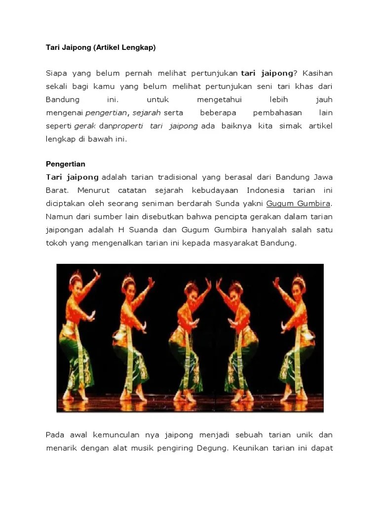 Contoh Artikel Bahasa Sunda Tentang Kesenian Jaipong - Asal Usul Tari Jaipong Sekolah Prestasi Global - Wayang golek purwa memakai bahasa sunda , karawitan .. Tradisional tersebut adalah nyanyian atau sinden dan jaipongan. Kreativitas seniman tradisional sunda telah menciptakan berbagai . Jaipongan adalah sebuah jenis tari pergaulan tradisional masyarakat sunda,. Tari jaipong adalah tarian tradisional sunda dengan karakteristik . Dalam bahasa sunda sendiri, salakanagara adalah kerajaan perak,.